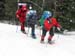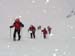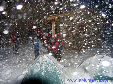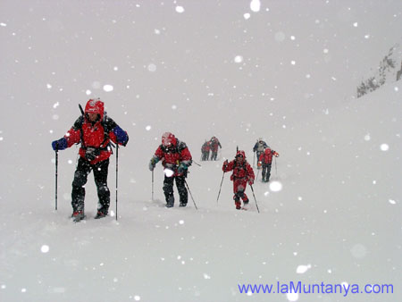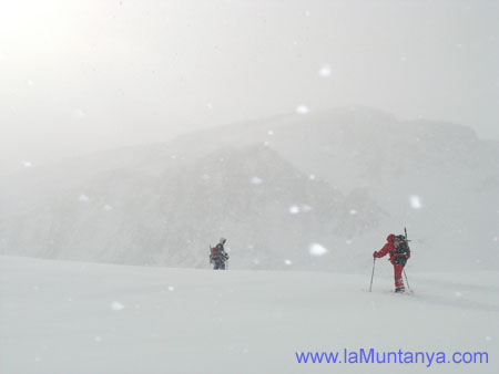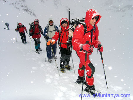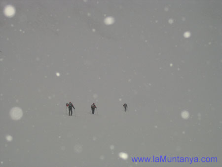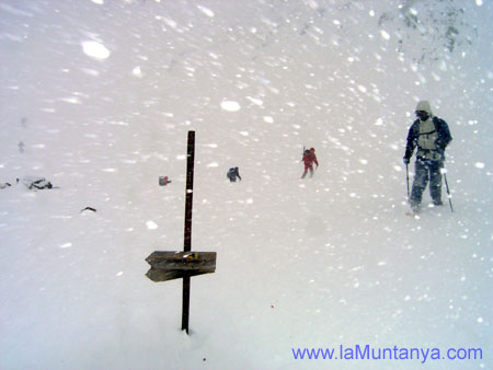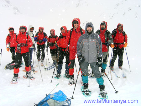 Les dures condicions meteorològiques (nevada moderada, vent fort, i temperatura de -15ºC amb molt mala visivilitat) fan tirar enrera a la majoria del grup, estant ja ben a prop del cim.