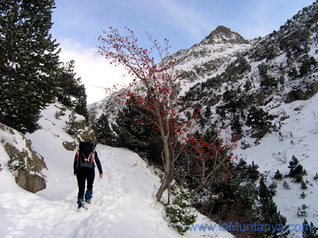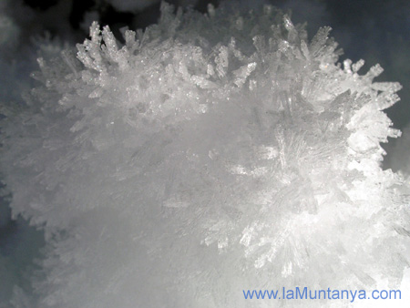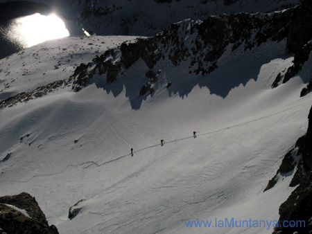 doble del que es tarda sense neu. Som els primers en llevar-nos a les 7 del matí, sembla que ningú té pressa, esmorzem, i a les 8 sortim amb la primera claror del dia. Som els primers en sortir del refugi, ja que ningú s’atreveix a obrir traça , i anem en sentit Nord, entrant pel marge dret al barranc de Respomuso (dret seguint el curs de l’aigua). A les primeres passes, ja ens adonem del que ens costarà progressar. Un bon gruix de neu pols recent caiguda ens acompanyarà tot el camí, i cal fer-nos a la idea que seran moltes hores de lenta i feixuga ascensió. Anem sols, rodejats de silenci que es trenca a cada passa, quan el peu s’enfonsa a la neu. El fred és suportable, i el cel és totalment ras.