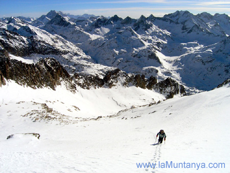 Continuem caminant, ara cap al N, fent una llarga flanqueig, sota l’Aresta Bondidier, buscant els llocs on ens enfonsem menys. De tant en tant trobem sectors on la neu ens arriba gairebé fins la cintura, on avancem a quatre grapes repenjats a la canyella de la cama, i amb el piolet agafat amb les dues mans, sobre la neu, pla davant nostre. Per sort, aquests trams tant complicats, no es fan massa llargs, i la major part del flanqueig, ens enfonsem només fins al genoll. Mirant enrera, veig un grup de tres alpinistes que segueixen la nostra traça. Penso que potser ens atraparan, i ens ajudaran a fer relleus. Portem unes 3 hores i mitja de camí, quan arribem a una gran cubeta que hi ha al final d’aquest circ. Una mica a la nostra esquerra, cap al NO, tenim la canal que porta dalt la Cresta de Frondellas, i darrera nostre, tenim el grup de tres alpinistes, que no se’ns acosten. Mantenen la distància, i si nosaltres parem ells també ho fan. Bona tàctica. Ens calcem els grampons, ja que a partir d’aquí el pendent augmenta considerablement, i trobem alguna placa de neu dura intercalada per la neu pols. Mica en mica ens anem acostant a la canal, que té uns 30 metres de longitud, i uns 40 graus d’inclinació. Dins la canal, tornem a trobar llocs on ens enfonsem fins la cintura, i tenim que repetir la tècnica de les quatre grapes varies vegades. Els nostres amics seguidors de traces segueixen practicant la intel•ligent tècnica de mantenir la distància. Finalment, desprès de gairebé 5 hores de camí (gairebé el doble del que és habitual), arribem dalt la cresta de Frondellas, i al Frondella Central (3.055m), des de on tenim una bona vista on destaca el Midi d’Ossau. Seguim per la ampla i fàcil cresta cap al cim principal. Ens trobem amb un pas curt de 3er grau, i seguim per la cresta que ara és més afilada, fins al Pico Frondella (3.071m). Aquí, la vista ja és total. Destaquen, ben a prop nostre el Balaïtous al N, cap al SE el Gran Facha que no aconsegueix tapar ni el Vignemale, ni la cara N d’Ordesa, del Monte Perdido als Gabietous, més al S, els Picos de Infierno, Garmo Negro i companyia, i cap a l’O, el Pirineu Navarro, amb el Midi d’Ossau en primer pla. Retornem i ens arribem facilment al Frondellas SW (3.001m). Busquem arrecerar-nos una mica per fer una queixalada, quan arriben els seguidors de traces. El primer ens ve saludar, i ens diu -¿Esto es el Balaïtous?-. Sobren els comentaris. La baixada en neu és molt ràpida, i en només 2 hores i mitja som al Refugi, amb una parada breu inclosa. Pel camí de Aguas Limpias, els arbres ja han descarregat la neu que omplia les seves branques el dia anterior, i el sender està ben glaçat en alguns trams. Recordar a qui vulgui visitar la zona, que és molt exposada a les allaus, fins al punt que el refugi resta tancat durant l’hivern per aquest motiu. Jordi Pons Corbella ---oooOOOooo--- |