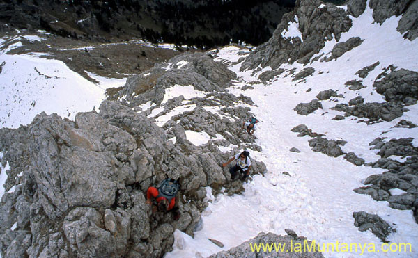 (2350m), on agafem la canal E del Pedraforca. És una gran tartera divertida