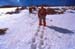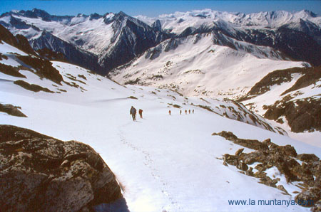 una dura jornada de muntanya i cal estar ben descansats. Diumenge ens llevem a les 5 del matí. Esmorzem, recollim les tendes, i agafem els cotxes per fer un curt trajecte fins al Pont de Lliterola a 1.600m, on deixem els cotxes. Abans de 2 quarts de 7 ja estem caminant pel bosc amb la primera claror del dia. Només sortir del bosc i enfilar els primers prats, a uns 2.000m d'alçada comencem a trobar neu i molt dura per cert. Ens calcem els grampons i amunt. L'estat de la neu és òptim per caminar i ens ajuda a progressar amb facilitat. Creuem algunes allaus baixades de les Tucas de Lliterola, i comencem a guanyar alçada tot fent un llarg flanqueig per sobre del Pla del Forcallo on hi ha la Cabana de Lliterola. Davant nostre sempre el Perdigueret que destaca per la seva roca fosca, i darrera la piràmide blanca del Hito del Perdiguero encara lluny nostre. Seguim amunt ara amb una mica més de pendent fins arribar al Ibon Inferior de Lliterola a 2.460m. Ens enfilem més a la dreta per no entrar al barranc profund que hi ha en aquest sector. Aquí ens comença a tocar el sol, però la temperatura una mica baixa encara manté la neu força dura. En José que fins ara estava animat i caminava amb força, pateix una gran davallada física i el tenim que deixar en un lloc assolellat, arrecerat i on raja aigua per sobre les roques, a veure si es refà. Els demés continuem amunt en direcció al Llac de Lliterola a 2.730m on arribem desprès de més de 4 hores de camí amb poques i breus parades. Descans per refer el grup i esperar en José que no arriba. Passem per l'Hito i seguim per la llarga cresta amb algun tram entretingut per les roques que dificulten el pas, i enfilem la rampa final fins al mateix cim del Perdiguero de 3.222m on arribem desprès de 7 hores de caminar. Visibilitat excel.lent, fort vent i lleugera sensació de fred que ens fan baixar abans del que voldríem, això sí, desprès de les obligades fotos tot dissimulant el cansament, i la filmada del David, el nostre reporter i animador. Uns metres més avall en tombar cap al vessant de Lliterola, la cresta ens tapa el vent i fem la parada per "dinar" i recuperar forces per la llarga baixada. Fort pendent en direcció al Llac de Lliterola clavant bé la puntera dels grampons, i fent pràctiques d'autodetenció amb piolet en el tram final. En arribar al Llac, i veient la gran quantitat de neu acumulada seguim ara per dintre del Barranc de Lliterola per tallar una mica de camí. La neu s'ha estovat bastant per efecte de la radiació solar i cada cop ens enfonsem més, però de baixada això no suposa cap gran problema. Arribem sense cap problema al Ibon on enllacem amb la nostra traça de pujada. Al tram final es nota ja el cansament del grup i alguns noten les lesions dels darrers anys. Arribem als vehicles desprès de més de 11 hores d'haver sortit,