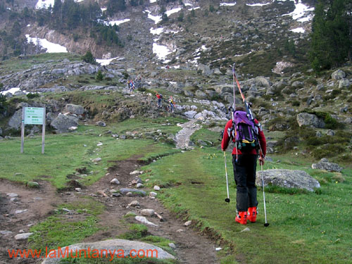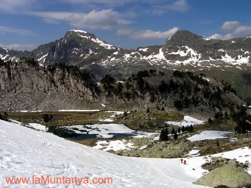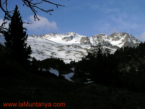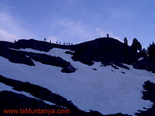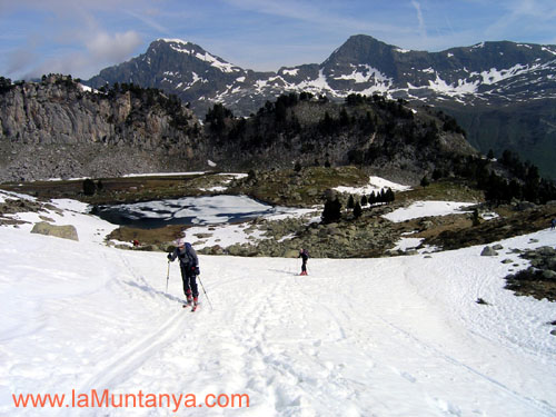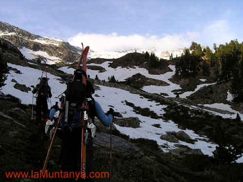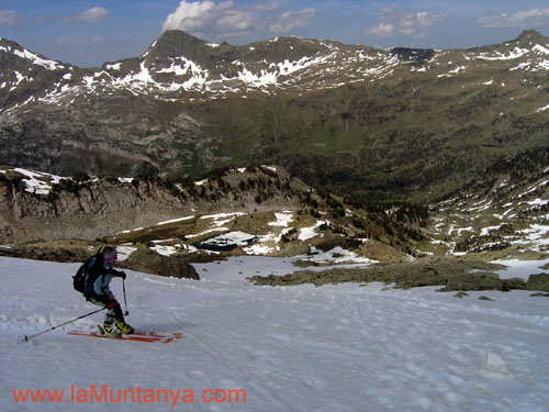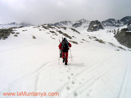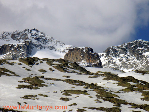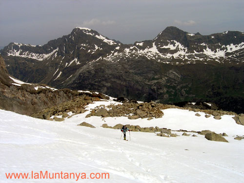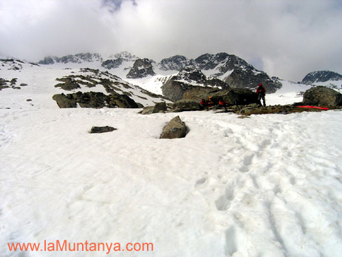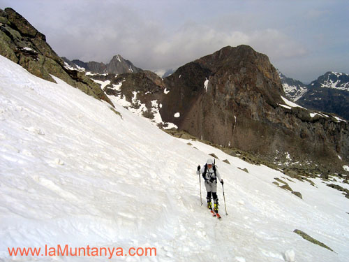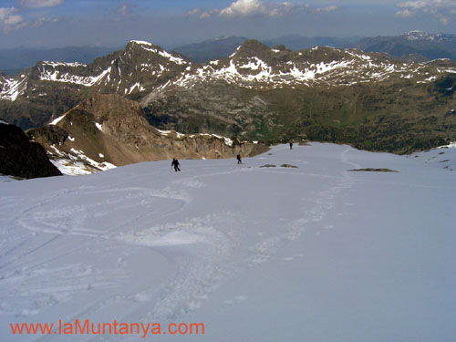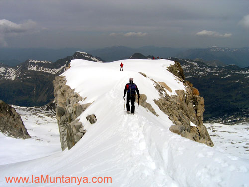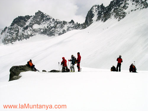 Descripció: A l’endemà ens llevem a les 5:30h, esmorzem, i agafem els cotxes fins la Besurta (1900m). Està a vessar de cotxes, moltíssima gent, i tots cap a l’Aneto és clar. Des d’aquí ja podem distingir la Torre Cordier cap al NO, i també la punteta de la teulada del refugi de la Renclusa. Dia serè amb algun núvol decoratiu, temperatura fresca, i vent encalmat. Carreguem els esquís a l’esquena, i són ja les 7:30h quan arrenquem a caminar. Pugem pel marcadíssim sender en direcció a la Renclusa formant una llarga filera de pirineistes amb complex de formiga. Trepitgem les primeres clapes de neu, i en gairebé 1 hora arribem a la Renclusa (2140m). Tornem a fixar la vista en el nostre objectiu, la Torre Cordier, que des d’aquí es torna a veure perfectament. Passat el refugi ens calcem els esquís, i fem els primers pendents cap a l’O, per una ampla canal que mena damunt l’ivó de Paderna. El grup es va estirant, doncs hi ha una gran diferència de nivell dins els diferents membres, i de tant en tant fem una parada per reagrupar-nos. Darrera nostre destaca l’ivó de Paderna, i més enllà els pics de Salbaguardia i de La Mina. Progressem sense problemes per amples pales pujant cap al N-NO seguint l’ampla carena que hi ha entre el barranc de la Maladeta i el barranc del Dién. Arribem a la font Oh Déus (2600m) on la neu tot just l’acaba de destapar, i on també tornem a veure clarament la Torre Cordier, ara ja molt més a prop nostre. Aprofitem per fer-hi una parada. Continuem pujant sempre en la mateixa direcció, enfilant tot dret com si anéssim cap a l’Esperó Cordier, per pendents ara més suaus. Estem ja damunt la glacera de la Maladeta que és com una gran pista d’esquí. Anem rodejant la Torre Cordier pel seu vessant E, mentre veiem com va canviant el seu aspecte. Pel N és una torre majestuosa, i per l’E s’assembla més al Dién de la Maladeta que té forma de punta que destaca suaument al mig de la glacera de la Maladeta. Arribant a prop de l’Esperó Cordier, tombem cap a l’O a buscar el coll de la Torre (3048m). Des d’aquí, sembla que hi hagi una passarel·la fins la torre, formada per una fina aresta de neu. L’Isaac i l’Alex que anaven més lleugers han aprofitat per pujar el pic Cordier mentre els demés anàvem arribant. Ara anem amb precaució cap a la torre per aquesta fina cornisa de neu fins la gran esplanada d’uns 20m de diàmetre que configura el cim de la Torre Cordier (3050m). Segueix fent fresca, tenim alguna ventada intermitent, i el cel mig ennuvolat ens deixa veure el sol a estones. Parada per descansar, menjar, jeure, beure, i veure la gran vista que mostra aquest excel·lent mirador. El descens fantàstic, amb neu primavera poc humida, per pales amples i suaus com si fos una gran pista vermella. Fins a l’ivó de Paderna 2240m són uns 800m de desnivell sense pausa, ni arbres, ni res que destorbi les nostres traçades i els nostres viratges. Bon final de temporada. Ara a guardar bé els esquís per al proper hivern.